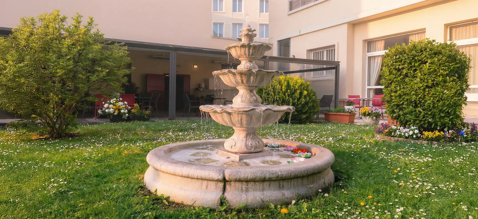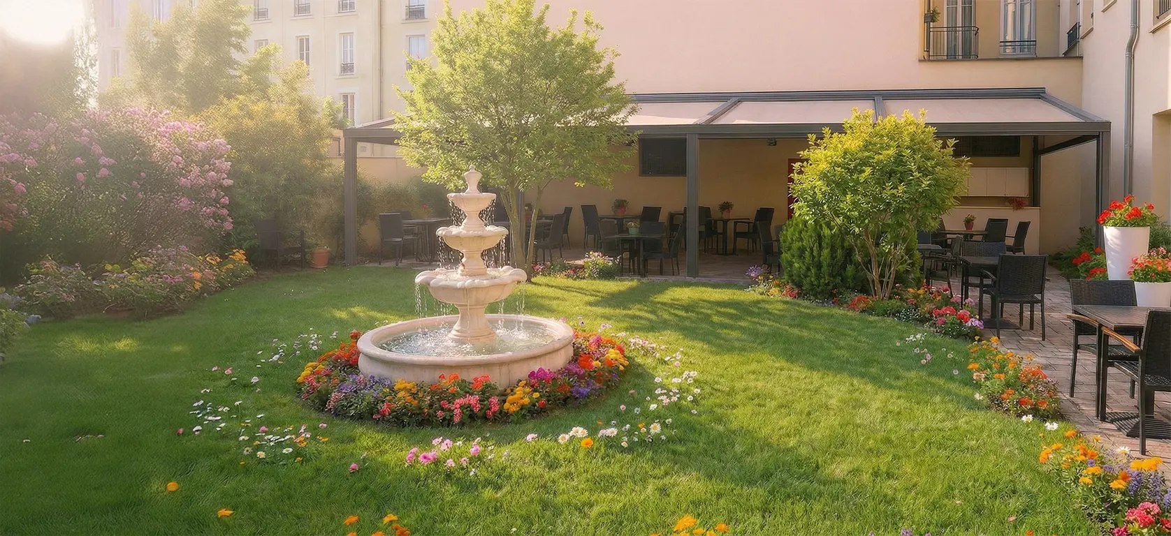 Grands arbres, pelouse soignée, massifs végétalisés, fontaine centrale… tout est pensé pour offrir une expérience sensorielle unique, entre nature, élégance et discrétion. Un luxe rare, réservé à ceux qui choisissent l’Hôtel du Parc.